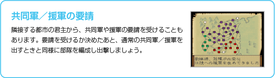 攻撃先に隣接する同盟国の都市があれば、そこに使者を送り、援軍を要請することができます。要請に成功すると援軍が送られます。 |