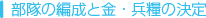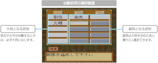 | 戦いの前には、出撃する武将や兵士を「部隊」として編成する必要があります。 最初に各部隊の大将と副将を選んで「決定」したあと、各部隊の兵数と兵科を選んで「決定」しましょう。 部隊の編成が終わったら、大将の中から総大将を選んでください。 ※部隊は最大5つ、武将は10人まで出陣できます。