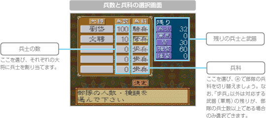 ※「軍馬」が対応する兵科は騎兵、「弩」が対応する兵科は弩兵です。 |