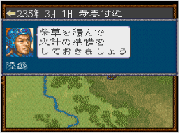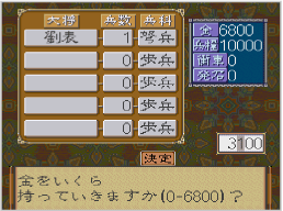 戦場に持っていく金と兵糧の数を決めましょう。金は戦争コマンドの「情報」を使うために必要となります。兵糧は戦争中兵士数に応じて消費され、なくなると部隊の士気が下がります。 また、攻城戦で役立つ衝車や発石車があれば、持っていくこともできます。 選択が終わると右の画面が表示され、「可」を選ぶと部隊が出撃します。 |