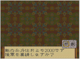 | 守備側は2つの戦略をとることができます。 「迎撃に出ますか?」という質問に対して「可」を選ぶと野戦、「否」を選ぶと攻城戦となります。 |