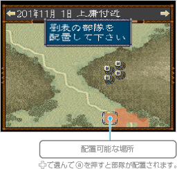 両軍の準備が終わったら、戦争画面が表示されます。守備側、攻撃側の順に、戦場に部隊を1つずつ配置しましょう。野戦では 配置が終わったあと、兵糧を持つ部隊を決めてください。 ※共同軍と援軍は数日後に到着し、自動的に配置されます。 |
