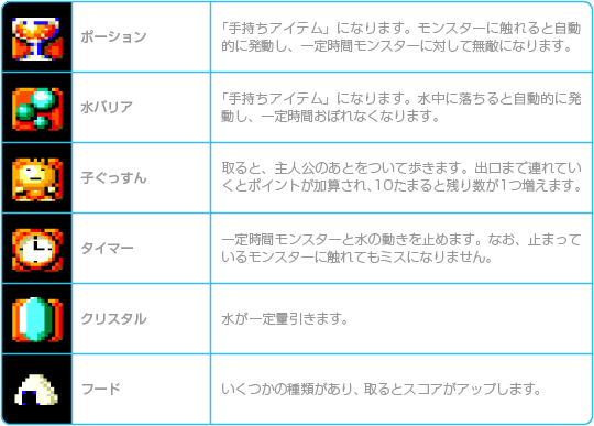 ステージ中に落ちているアイテムは、主人公が通過すると手に入れることができます。 アイテムには取るとすぐ効果があるものと、「手持ちアイテム」に加わるものがあります。手持ちアイテムは最大2つ持つことができ、必要なときに自動的に効果を発揮します。 ![]() |
