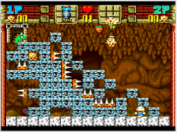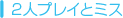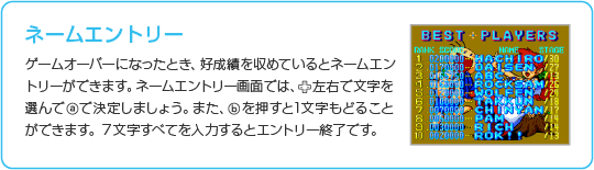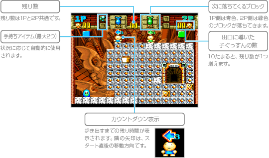 2人プレイで先にミスしたプレイヤーは、相手がステージをクリアするかミスするまでプレイできません。また、1Pと2Pが両方ともミスすると、ステージの最初からやり直しとなります。 |
