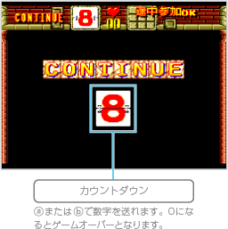 ゲーム中にミスすると、残り数が1つ減ってステージを最初からやり直します。残り数が0のときにミスするとコンティニュー画面が表示され、カウントダウン中に |