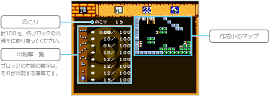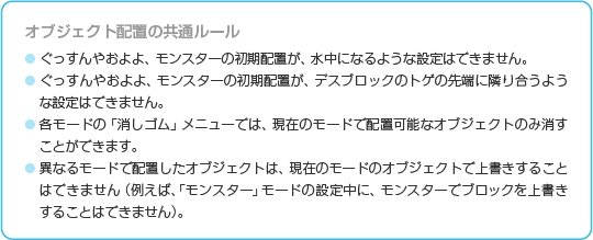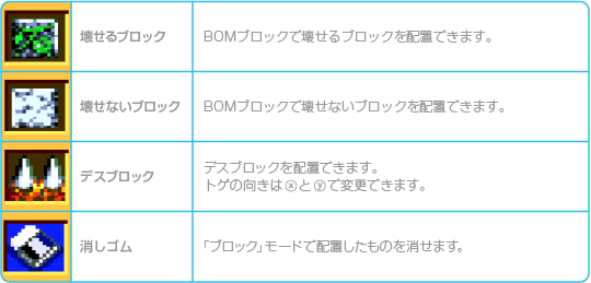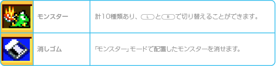 「えでぃっと」の作成画面には、9つのモード選択メニューが用意されています。 いずれかを選び、さまざまなモードメニューで設定を行いましょう。 なお、「ブロック」「でぐち」「プレイヤー」「モンスター」「アイテム」の各モードでは、 ![]() |