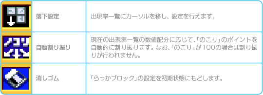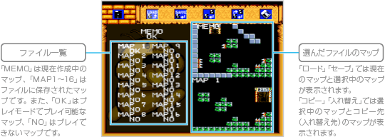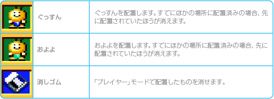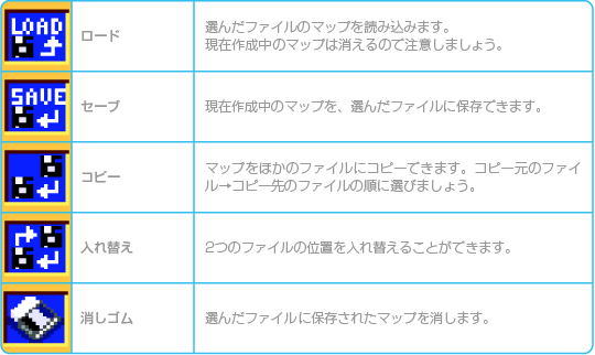 ![]() ![]() ※「セーブ」「コピー」「消しゴム」で上書きしたり、消されたデータは復活できないので注意しましょう。 |