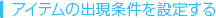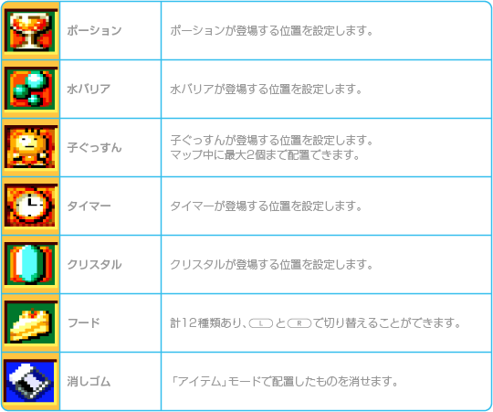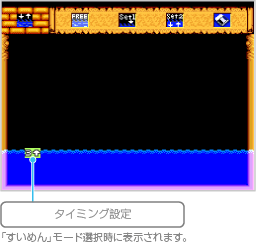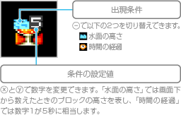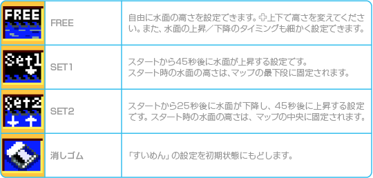 途中出現するアイテムには、出現条件を設定することができます。条件は「水面の高さ」と「時間の経過」の2種類あり、「水面の高さ」では、水面が上昇して設定した高さまで達するとアイテムが出現します。「時間の経過」では、ゲームスタートから設定した時間が経過したときアイテムが出現します。 |