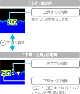 タイミング設定には「上昇(一定時間後に水面が上昇する)」と「下降+上昇(一定時間後に水面が下降し、それから上昇する)」の2種類があります。 |