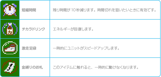 バトル中は、フィールド上にさまざまなアイテムが登場することがあります。これらを取ると、さまざまな効果が発生します。 |