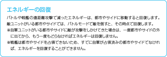 相手のエネルギーを0にすると、相手ユニットを破壊して勝利します。また、時間切れの場合、残りエネルギーの少ないほうのユニットがマスから追い出され、自軍の首都に近い方向に数マス分後退します。マップの端などでマスから追い出されると、後退することができず、ユニットが破壊されることもあります。 |