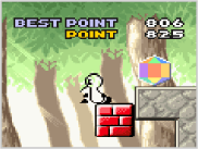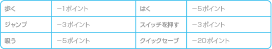 各面にはそれぞれ初期ポイントが設定されています。ポイントは“はっくん”を動かしたりすると減っていき、面をクリアすると残ったポイントを獲得できます。各面ごとに、これまでに獲得した最高ポイントはベストポイントとして保存されます。 |