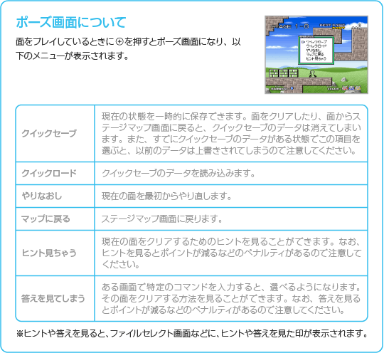 “はっくん”が穴に落ちたり、トゲトゲに刺さると、その面の最初やクイックセーブを行った場所からやり直しになります。また、ブロックなどの動かしかたによっては、その後どんな行動をしても「虹のかけら」までたどり着けなくなり、手詰まりになることがあります。手詰まりになった場合は、ポーズ画面で「やりなおし」を選んで最初からやり直してください。 |