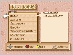 ファイルセレクト画面で「はじめから」を選んだり、ステージマップ画面で「はっくん小屋」を選ぶと、はっくん小屋に行くことができます。ここではゲームの詳しい説明を見たり、操作の確認ができます。また、コントローラの各ボタンの役割を変更することもできます。 |