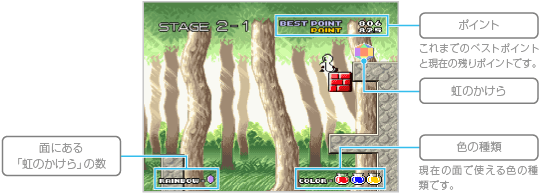 “はっくん”を操作して、面にある「虹のかけら」をすべて集めるとクリアです。ブロックなどを吸って運び、そのブロックをはいて「虹のかけら」までの足場を作ってください。なお、ブロックは「色」をつけると、上下左右、斜めに動かすこともできます。ブロックをうまく配置して「虹のかけら」を集めてください。 ![]() |