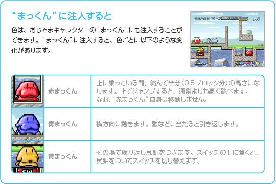 色には「赤」「青」「黄」の3色があり、ブロックと同じように ![]() |