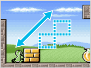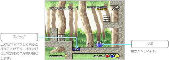 「黄」を注入すると、斜め方向に動くブロックになります。色を注入した場所から2ブロック分左または右斜め上に動き、元の位置に戻る動きを繰り返します。なお、ブロックは色を注入したときに“はっくん”が向いている方向に動きます。 |