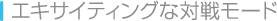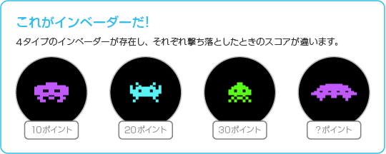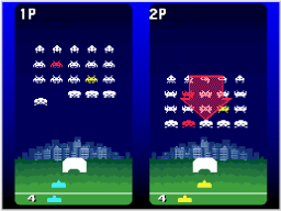 | 対戦モードでは、友だちと対戦できます。 ルールはいたってシンプル。相手より先にすべてのインベーダーを撃ち落とせば勝利です。また、緑や赤など特定のインベーダーを撃ち落とすと、相手のジャマができたり、自分が不利になってしまったり、さまざまなことが起こります。 これらを利用して、相手との駆け引きを楽しみましょう。 |