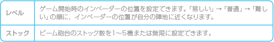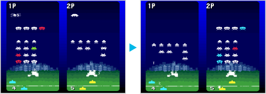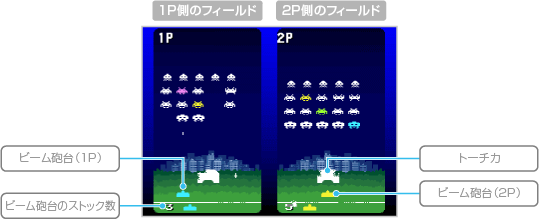 先にすべてのインベーダーを撃ち落としたプレイヤーの勝ちとなります。インベーダーに陣地を占領されてしまったり、ビーム砲台のストック数が0になると負けです。 なお、インベーダーを横1列分撃ち落とすと、対戦相手のフィールドにもう1列のインベーダーが出現します。 ![]() |