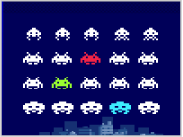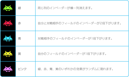 一部のインベーダーには、緑や赤などの色がついています。これらのインベーダーは時間の経過とともに色が変化していき、撃ち落としたときの色によってさまざまな効果が現れます。 |