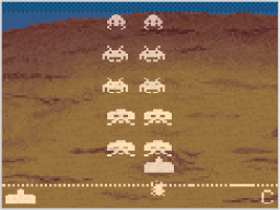 10ポイントのインベーダーを1匹だけ残すと、インベーダーの移動した軌跡が残る「レインボー」と呼ばれる現象が起こります。 10ポイントのインベーダーを残すには、インベーダーを撃ち落とすタイミングが重要になります。インベーダーは下の段から上の段にかけて順に移動するので、移動してずれた瞬間を狙いましょう。 |
