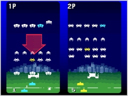 対戦モードでは、カラーインベーダーを撃ち落とすタイミングが勝負のカギとなります。カラーインベーダーは、赤→青→ピンク→黄→緑の順に変化します。撃ち落とした色によっては、自分に不利な効果が発動してしまうので、撃ち落とすタイミングを見きわめましょう。 |