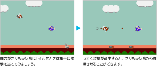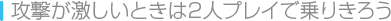 敵の攻撃が激しくて、きりもみ状態になる回数が多い……。そんなときは2人プレイがオススメです。きりもみ状態の味方に攻撃を当てると、すぐに復帰させることができるのです。このテクニックを活かして、難しいステージのクリアをめざしましょう。
