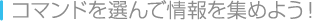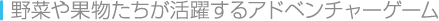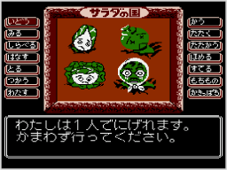 | プレイヤーが操作するキュウリ戦士の行動は、コマンド入力で指定します。「いどう」や「みる」、「しらべる」といった基本的なコマンドから、「たたく」や「ほめる」といったちょっと変わったものまで、さまざまなコマンドから行動を選び、情報やアイテムなどを集めてください。一見不要そうなコマンドも、選んでみるとおもしろい展開になることも……。 | ![]() |