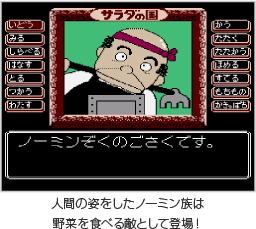 | 『サラダの国のトマト姫』は、擬人化された野菜や果物たちが住む星を舞台にしたアドベンチャーゲームです。1984年にパソコン版が発売され、その後1988年5月27日にファミコン版が発売されました。 | ![]() |