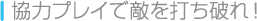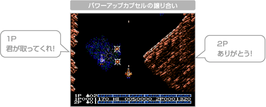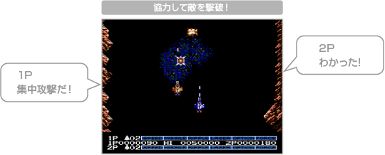 本ゲームの2人プレイは、2人で同時に敵と戦う協力プレイ。1人ではなかなか突破できない難所も、2人で協力すればあっさり突破できることも。互いに助け合いながら、先へ進んでいきましょう。 ![]() ![]() |
