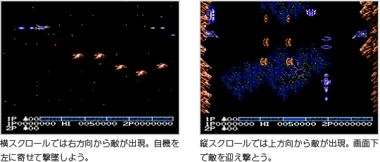 本ゲームには、横スクロールステージと縦スクロールステージが交互に登場します。 それぞれの特徴を把握し、敵を倒していってください。 ![]() |