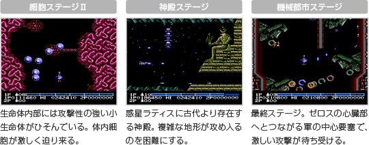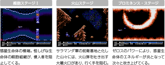 本ゲームのステージは、生物の中だったり、火山地帯だったり、さまざまな特徴があります。 自機を狙う仕掛けも待ちかまえているので、慎重に進みましょう。 ![]() ![]() |
