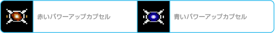 特定の敵や編隊を倒すとパワーアップカプセルが現れます。赤いパワーアップカプセルは自機のパワーアップに使い、青いパワーアップカプセルは画面内の弱い敵を消し去る効果があります。