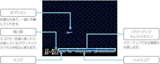 ※障害物を破壊すると点滅しているパワーアップカプセルが出現することがあり、取ると自機の残り数が1増えします。
