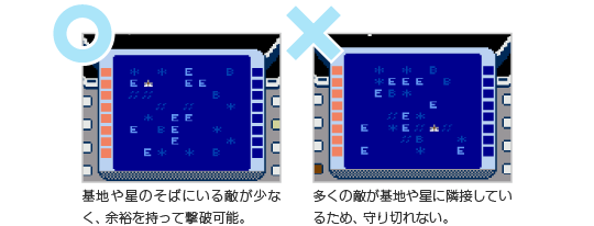 戦場となるエリア上の、敵や星などの配置はプレイするたびに変わります。それぞれの位置関係によって難易度が大きく変わるので、ゲームを始めたらまずマップモードでレーダーをしっかり確認し、戦いやすさを見きわめるといいでしょう。 ![]() |