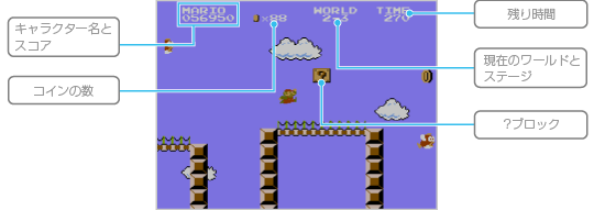 ?ブロックを下から叩くと、コインやさまざまなアイテムが出てきます。?ブロック以外にもアイテムが出るブロックがあるので探してみましょう。 |