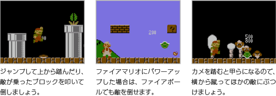 敵を上から踏んだり、敵が乗っているブロックを下から叩くと倒せます。 ほかにも、ファイアボールを投げたり、甲らを蹴って敵に当てて倒すこともできます。 ただし、なかには踏んだりファイアボールを当てても倒せない敵がいるので注意しましょう。 ![]() |