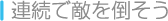 複数の敵が集まっている場合は、連続で踏んで倒しましょう。着地せずに踏み続けると、スコアがだんだん増えていきます。 また、甲らを蹴って連続で敵を倒した場合もスコアがだんだん増えていきます。 |