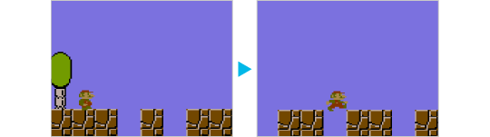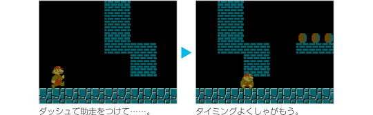 マリオでは通ることができても、スーパーマリオやファイアマリオでは体が大きくて通れないように見える場所があります。そういう場所は、ダッシュ中にタイミングよくしゃがむとくぐり抜けることができます。 ![]() |