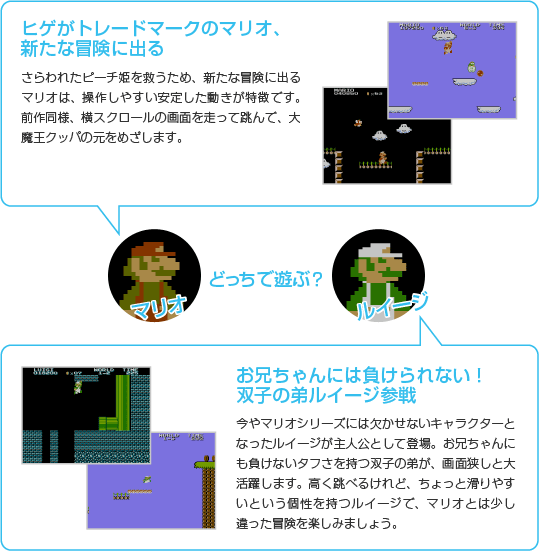 一大ブームを巻き起こした『スーパーマリオブラザーズ』。その2作目である本ゲームは、1986年6月3日にディスクシステム用ソフトとして発売されました。横スクロールアクションの面白さをそのままに、新たなアイテムなどが登場し、さらにパワーアップして帰ってきました。![]() |