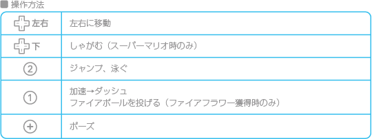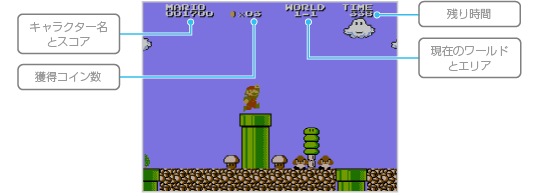 マリオまたはルイージを操作して敵を倒しながら先に進み、決められた時間内に各エリアのゴールにたどり着くとクリアになります。4つのエリアをクリアすると1ワールド終了になり、次のワールドに進みます。 |