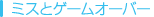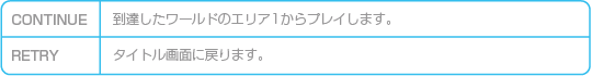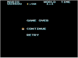 敵などに当たったり、穴に落ちるとミスになります。残り時間が0になるまでにゴールできない場合もミスになり、プレイヤー数が1つ減ります。 なお、スーパーマリオやファイアマリオの状態で敵などに当たった場合は、マリオに戻ってゲームを続けることができます。プレイヤー数が1のときにミスするとゲームオーバーになり、以下のメニューが表示されます。 |