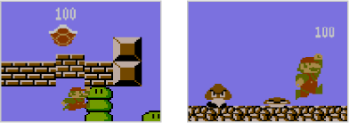 上から踏んだり、敵が乗っているブロックを下からたたいたりしてください。こうら状態のキャラクターは横から蹴ることができます。ただし、なかには踏めない敵もいるので注意しましょう。 |