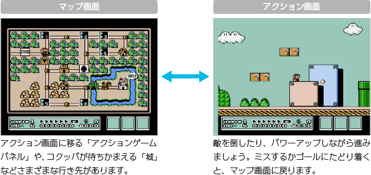 マリオたちが冒険する8つのワールドには、それぞれマップがあります。タイトル画面でプレイ人数を選ぶとワールド1のマップ画面に移るので、行き先を選んで移動してください。行き先のうちアクションゲームパネルを選ぶとアクション画面に移るので、マリオを操作してゴールをめざしましょう。 ![]() |