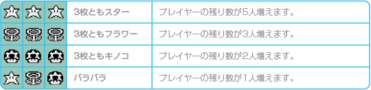 ゴールにはカードが高速で切り替わっているエリアがあり、触れるとカードを手に入れてクリアとなります。カードはキノコ、フラワー、スターの3種類で、3枚集めるとプレイヤーの残り数が増えます。 |