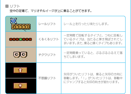アイテムを取ると、マリオやルイージがパワーアップします。パワーアップするとさまざまなアクションができるようになりますが、ミスすると元の状態に戻ってしまうので注意しましょう。 ![]() |
