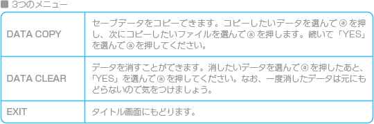 ゲームの進行状況は3つのサムスデータのいずれかに保存されます。 ![]() ![]() |