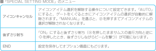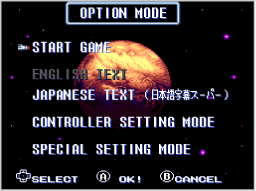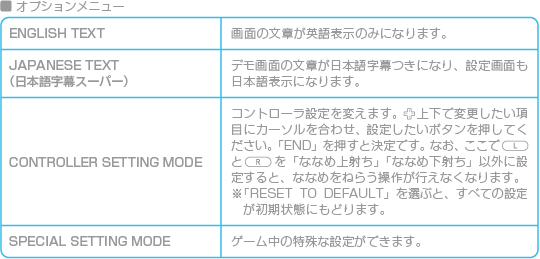 オプション画面ではゲーム中のさまざまな設定が行えます。設定が終わったら、「START GAME」を選んで ※「JAPANESE TEXT(日本語字幕スーパー)」を選ばないと、ゲーム中のメッセージがすべて英語のみとなるので注意しましょう。