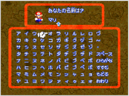 「ニューゲーム」を選んで、冒険をセーブするファイルに名前をつけましょう。 入力が終わったら「おわり」を選びましょう。 ※ここで入力できるのはファイルの名前です。マリオの名前は変更されません。 |