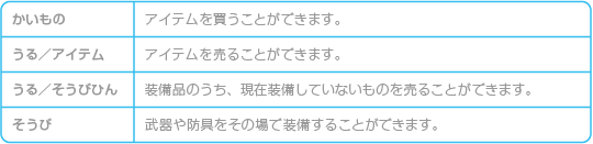キノコの看板が目印の道具屋では、アイテムを売り買いできます。お店の人に話しかけて、以下のメニューから選びましょう。